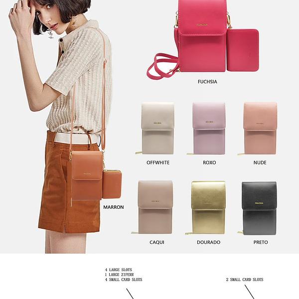 KIT BOLSINHA MISS BELA — MODELO EM COURINO SINTÉTICO C/ ALCA REMOVÍVEL E REGULÁVEL. — MODELO ACOMPANHA CARTEIRA